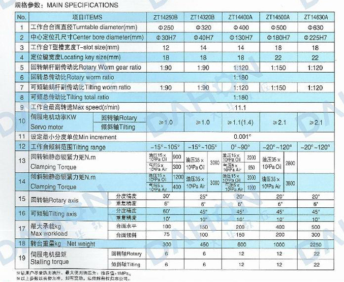 ZT 14 NC rotary table is constructed complete with an NC controllable rotary axis as well as an NC controllabletilting axis,and mainly used with CNC milling machine and machine center,It is controlled either by two-coordinatecontrol system of the main machine or by selfequipped two-coordinate control system.In combination with mainmachine,holes,slots,cam,curving line and surface in any angle position can be carried out precisely.Besides,it can alsobe used in common drilling,milling and boring machines,performing independently equal and unequal divisions.